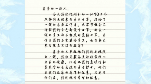 “其实捐赠口罩之时,我们内部员工的口罩物资也相当紧缺,即便如此,口罩抵达企业物流中心的当晚,一树药业董事会就连夜一致决定:把第一批采购到的10万个防护级别高的韩国口罩捐赠给全省一线医护人员。” 一树药业品牌文化中心总监王艳介绍道,然而,面对集团6000多员工的口罩需求,一树药业董事长王春雷却心怀愧疚。 为了让员工们能够理解企业的做法和初衷,王春雷给全体员工写了一封“一树家书”。“这份家书传达出的是董事会的真实想法,得到了员工的高度认可。如果说我们守住生命防线的医生都没有防控口罩的话,谁来守护我们自己和家人的生命底线?如果最后一道防线都没有,可能谁都无法安心去社会上做贡献。于是,在此时此刻下,企业做了这样一个决定。”一树药业董事长王春雷表示。