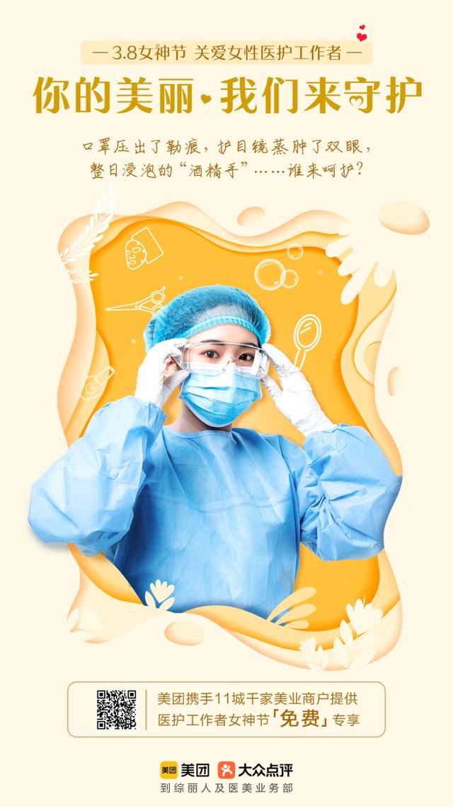 这个"3.8女神节",对于抗疫一线的医护人员们来说,尤为特殊。 在抗疫战场上,她们"巾帼不让须眉",独立、勇敢、坚守,她们的秀发为了防疫被剪短,她们的面庞因为长期戴口罩留下勒痕、起了红疹,她们的眼睛被护目镜蒸肿、她们的手长期洗手消毒变成"酒精手"…… 3月8日到3月10日,美团到综丽人及医美业务携手北京、上海、广州、成都等11城千家美业商户,为女性医护工作者提供数十万份免费"专享美丽服务"。