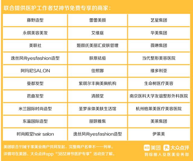 "专享美丽服务"中,包括"洗剪吹"美发三件套、小气泡美容护肤、SPA按摩、纯色美甲等服务,可以快速唤醒女性医护工作者们本来的美丽。 联合提供免费服务的上千家美业商家,分布在医美、美容、美发、美甲等行业,不乏技术过硬、服务质量高的品牌连锁商家,包括美发连锁商家藤野造型、永琪美容美发,美容知名品牌蕾蕾美颜、艾维庭,以及医美机构艺星集团、华美集团等。 实际上,不少商家都自发进行了一些针对医护人员的免费活动,和社会各界一起关爱医护工作者。"美团组织我们一起参与38女神节的特别活动,希望能让更多医护工作者真正了解和享受到我们的服务,感谢这些抗疫女战士们。"一位美业商家表示。 此次女神节关爱医护人员活动覆盖北京、上海、广州、深圳、成都、重庆、南京、杭州、天津、西安和武汉11个城市,其中参与门店数量最多的城市为上海、北京和杭州,提供"免费专享服务"价值最高的城市是北京、成都和武汉。