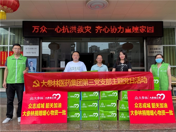 自今年6月起,广东省韶关市均受强降雨侵袭,引发多个村镇发生洪涝灾害,暴雨引发的灾情牵动着社会各界人士的心。 大参林医药集团股份有限公司第三党支部第一时间组织人力物力,开通公司内部绿色通道,携手暖心企业向受灾群众捐赠消毒液、防蚊喷雾等爱心用品,向浈江区残疾人联合会和曲江区市场监督管理局捐赠物资共计价值5万余元。 大参林相关负责人表示,洪水无情人有情,能够为受灾群众尽一点绵薄之力,这也是我们企业应尽的责任和义务。大参林作为一家上市医药连锁企业,将继续积极履行社会责任,尽己所能与国家、时代发展共振。