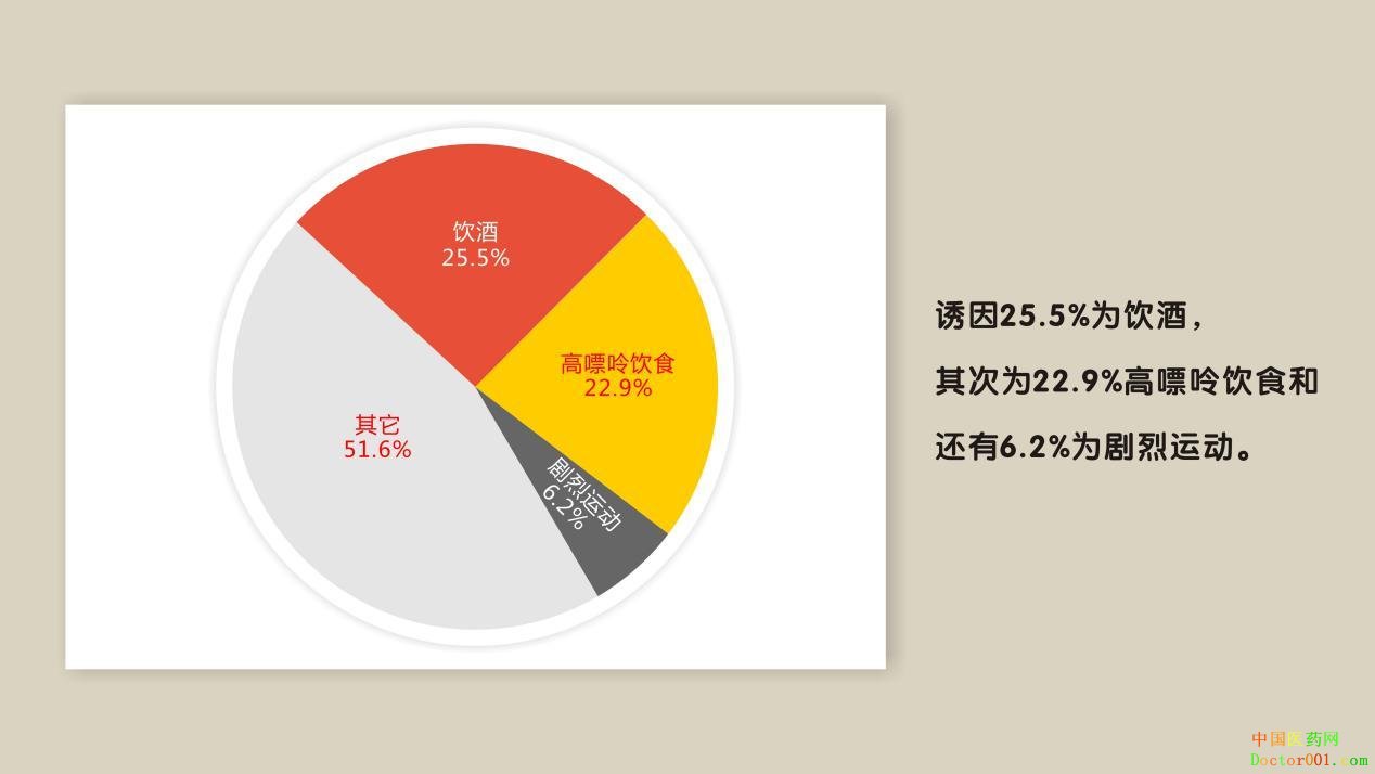 这种疾病的诱因25.5%为饮酒, 其次为22.9%高嘌呤饮食和还有6.2%为剧烈运动。