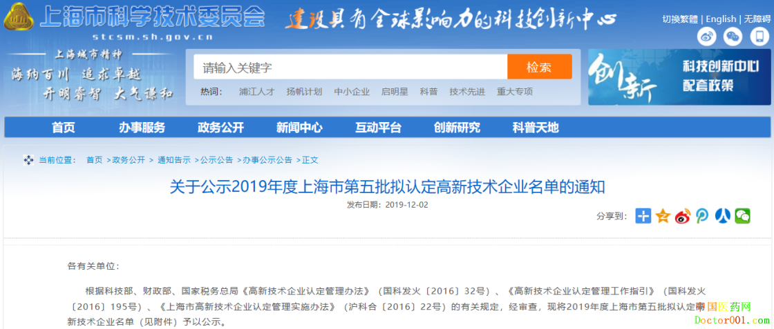 上海市科委公布2019年度上海市第五批拟认定高新技术企业名单