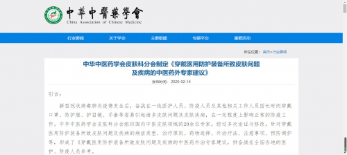 2019年新型冠状病毒肺炎疫情发生以来,形势严峻,牵动国人心。随着新冠肺炎防控诊治工作的深入开展,奋战在一线的医护人员、防疫人员及其他相关工作人员由于长时间穿戴口罩、防护服、护目镜、手套等,容易出现诸多皮肤问题及皮肤疾病,在一定程度上影响正常的防疫工作。 因此,中华中医药学会皮肤科分会组织国内皮肤领域相关专家,针对穿戴医用防护装备所致皮肤问题及皮肤疾病,制定出中医外治专家建议,即《穿戴医用防护装备所致皮肤问题及疾病的中医药外治专家建议》,简称《建议》。