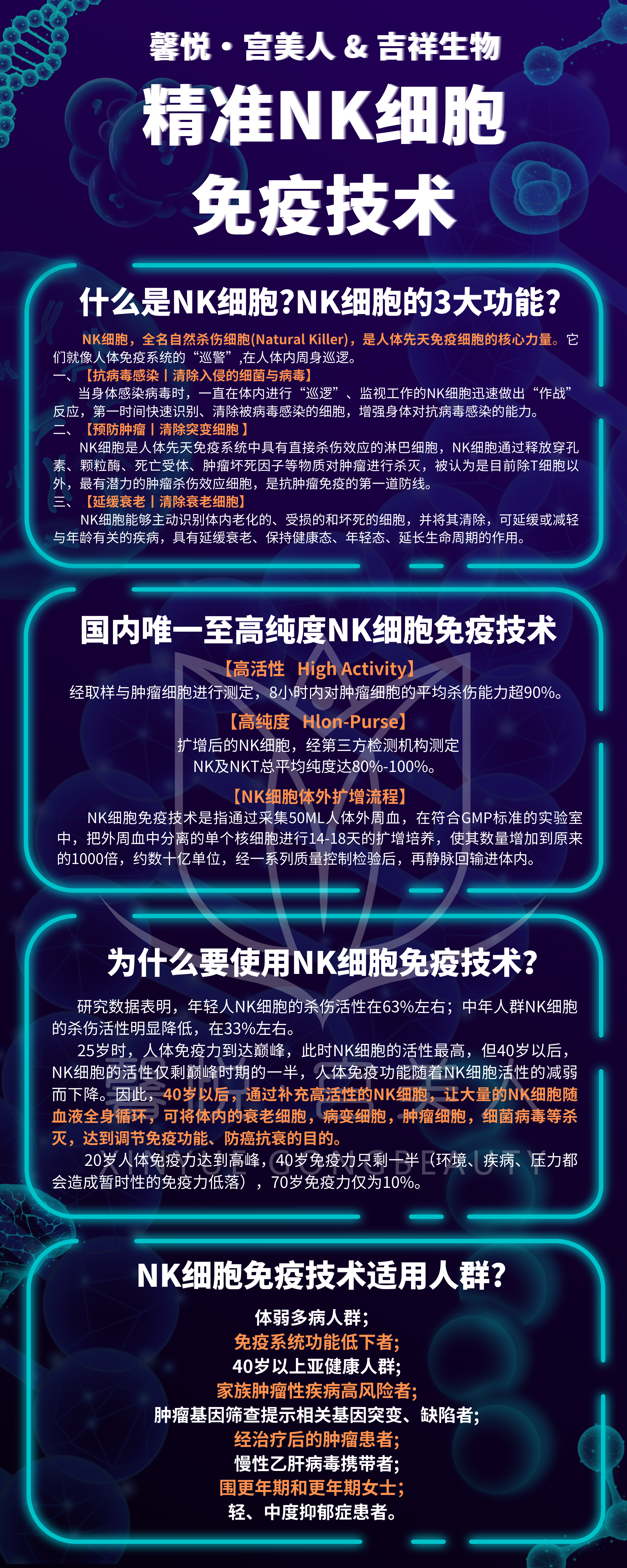 馨悦·宫美人全科医疗医美服务中心,是在中国首例变性手术开创者——北大三院的资深医疗专家倡导下,于2021年成立的一家专注于两性医学的全科医疗服务中心,也是一站式两性生殖解决服务平台。目前在职医学专家有生物医学研究、妇产科、泌尿科、肛肠科、整形外科、康复运动学科、两性心理及社会学等二十余位,且全部具备三甲医院认可资质。馨悦·宫美人全科医疗医美服务中心,坐落于浙江省杭州市余杭区杭州树康医院。树康医院是杭州市一家市级标杆二级甲等康复医院,已与多家三甲医院及医疗机构达成战略合作,获得多项省级荣誉。 馨悦·宫美人拥有五大医疗医美体系:生殖抗衰医疗医美、面部逆龄医美、国内唯一至高纯度NK细胞免疫技术、骨雕复位美体整脊正骨、全科体检。 【国内唯一至高纯度精准NK细胞免疫技术】 NK细胞免疫技术是指通过采集50ML人体外周血,在符合GMP标准的实验室中,把外周血中分离的单个核细胞进行扩增培养,使其数量增加到原来的1000倍,再静脉回输进体内。 NK细胞体外扩增流程: STEP1:采集50毫升左右的外周血。 STEP2:在符合GMP标准的实验室进行分离,提取外周血中的单个核细胞。 STEP3:通过14-18天的扩增培养,培养出数十亿单位的NK细胞。 STEP4:通过一系列的质量控制检验后,回输入体内。
