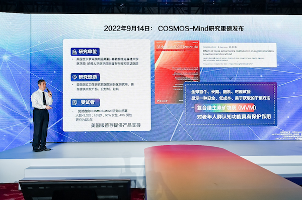 赫力昂营养保健品事业部善存市场部总监沈洁 现场演讲(活动现场照) 赫力昂营养保健品事业部善存市场部总监沈洁表示:“40年来,善存始终矢志不移,大力推进循证营养科学,致力于赋能全世界消费者的健康精彩生活。从去年 COSMOS-Mind到今年的COSMOS-Web,我们发现通过每天坚持服用复维补剂,就有可能改善中老年认知健康。这对我们来说,无疑是振奋人心的大好消息,也是勇攀高峰的巨大动力。” COSMOS-Web重磅发布 复合维矿助益预防认知衰老 《中国居民膳食指南研究报告2021》指出,我国老年人维生素B1、维生素B2、叶酸等摄入不足的比例均高于80%,而合理营养恰恰又对维护认知功能有着重要作用。 中国疾控中心营养与健康所杨晓光教授认为:“大脑像一座结构精密功能复杂的工厂,早期预防脑衰老是维护‘脑工厂’健康运转的关键所在。多种维生素矿物质有助于延缓细胞氧化、促进细胞更新、抵御DNA损伤,可能延缓认知受损的进程。”