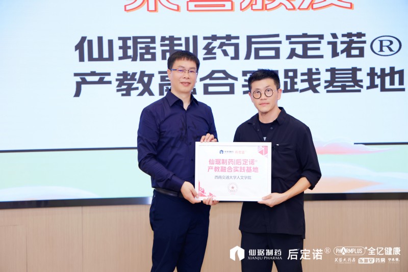 全亿健康成都事业部总经理 何英女士 荣誉颁发:产教融合基地落地交大 在全场关注下,仙琚制药 OTC 事业部总监泮小波先生为西南交通大学人文学院代表李阳老师颁发《仙琚制药 | 后定诺 ® 产教融合人才实践基地》证书。李阳老师接过证书并表示,实践基地的成立将推动健康传播人才培养模式创新,实现教学与行业实践的深度衔接。