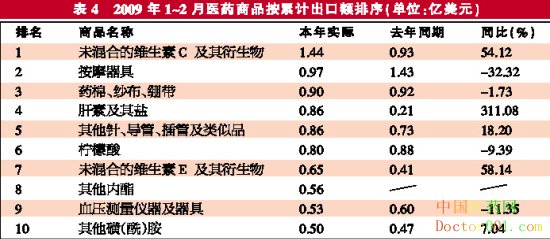 从产品类别看,2月医药原料药类前十名出口金额达到了2.88亿美元,占全部出口总额的比例达到了53.01%。其中,未混合的维生素C及其衍生物出口在金额和数量上遥遥领先。 目前,维生素C仍是我国医药商品出口的主体部分。受国际市场影响,价格持续高攀,最高达到13.28美元/公斤。维生药业、东北制药总厂、河北维尔康制药、江苏江山制药这“四大家族”占据了83%的市场份额,维生素C出口前景依然看好。 ![]() ![]() |