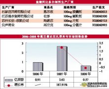 扑热息痛:数量明显下滑 据中国海关统计:2008年1~12月,扑热息痛出口数量为42387.66吨,同比下降8.68%;出口金额为17128.57万美元,同比增长23.75%;出口平均单价4.04美元/公斤,同比增长35.57%。 从数据看,2008年扑热息痛虽然实现了出口金额及价格的双增...