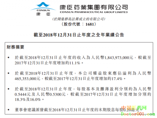2019年3月20日,康臣药业(1681.HK)公布2018财年业绩,录得营收18.44亿元(人民币,下同),同比增长11.1%,其中康臣药业主体业务(不含玉林制药分部)经营规模突破12亿元;公司权益股东应占利润4.65亿元,同比增长17.4%,经营性净现金流达到7.54亿,同比增长199.1%。公司宣布每股派息0.2港元。