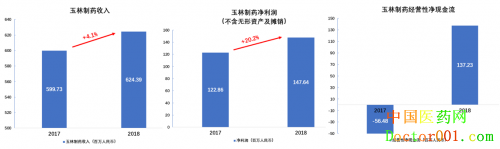 产能方面则是扩张明显。2019年1月20日,玉林制药在玉林中医药健康产业园隆重举行了封顶仪式,目前已基本完成园区北区8栋建筑的封顶工作,而在2017年10月,公司已经完成园区南区2万平方米的仓库的封顶工作,意味着,新区建设已经迈入新阶段。玉林制药新地点规划用地600多亩,计划总投资额逾人民币10亿元,三期建设完工投产后,产能将是目前的6倍。 图表二:玉林制药2017与2018收入,净利润与净现金流