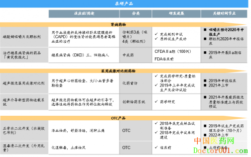 图表四:康臣药业应收账款余额 数据来源:公司公告,格隆汇整理 研发管线 作为医药制药企业,研发与创新是发展的第一动力。下图为康臣药业目前在研产品进度表,其中最值得关注的是肾病药物的两项产品,碳酸镧与黄氏散微丸,两款产品的成功研制,将完成公司对慢性肾病1-5期的全面覆盖。 图表五:康臣药业研发管线