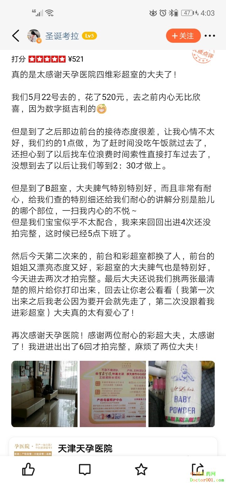 真的是太感谢天孕医院四维彩超室的大夫了! 我们5月22号去的,花了520元,去之前内心无比欣喜,因为数字挺吉利的!但是到了之后那边前台的接待态度很差,让我心情不太好,我们约的1点做,为了赶时间没吃午饭就过去了,还担心到了以后找车位浪费时间索性直接打车过去了,没想到去了以后让我们等到2:30才做上。 但是到了B超室,大夫脾气特别特别好,而且非常有耐心,给我们查的特别细还给我们耐心的讲解分别是胎儿的哪个部位,一扫我内心的不悦~但是我们宝宝似乎不太配合,我来来回回出进4次还没拍完整,这时候已经5点下班了。 然后今天第二次来的,前台和彩超室都换了人,前台的姐姐又漂亮态度又好,彩超室的大夫脾气也是特别好,今天进去两次才拍完整。最后大夫还说我们挑两张最清楚的照片给你打印出来,回去让你老公看看(我第一次出来之后我老公因为要开会就先走了,第二次没跟着我进彩超室)大夫真的太有爱心了! 再次感谢天孕医院!感谢两位耐心的彩超大夫,太感谢了!我进进出出了6回才拍完整,麻烦了两位大夫!