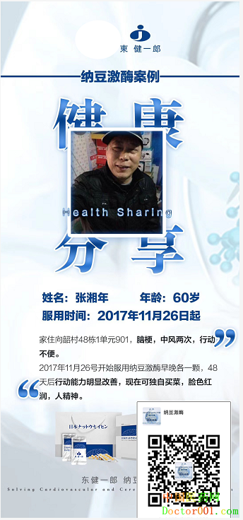 张湘年,患有脑梗,曾经两次中风,导致行动不便,从2017年11月26日期开始服用东健一郎纳豆激酶,早晚各一粒,48天后行动能力明显改善,现在可以独自上街买菜,脸色红润,精神状态非常好。
