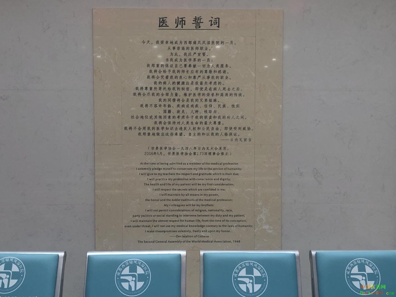 “今天,我荣幸地成为西部痛风风湿医院的一员,从事崇高的医师职业。为此,我庄严宣誓:当我成为医学界的一员:我郑重的保证自己要奉献一切为人类服务。我将会给予我的师长应有的尊敬和感谢。我将会凭着我的良心和尊严从事我的职业……”