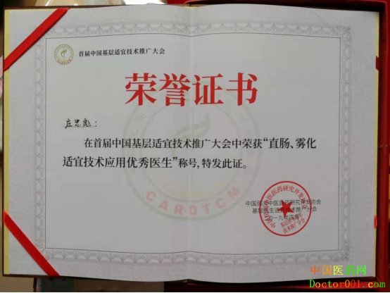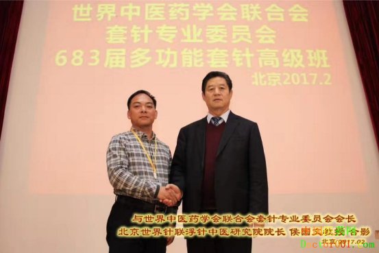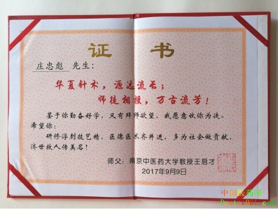 符庄彪与张炜老师合影 学医从来都不是一条好走的坦途,艰难险阻,荆棘遍布。符庄彪当然知道,但他从不畏惧,从决定从医开始,他再没有了业余时间,不是在翻阅浩瀚的医学典籍,就是在实践中苦练自己的技术。初学针灸时他反反复复的在自己身上实验,自己身上经常因此青一块紫一块,只为保障以后一切都力求精准,因为他知道他所从事的医学,是一件非常严肃非常严谨的学科,比工业制造业要更加精准不容偏差,一旦失误很可能会毁掉一个人的健康乃至生命,所以他不断训练,马虎不得。 符庄彪所学的套针,和普通针灸相比最大的区别在于操作中钝头针芯的应用,在操作中能最大程度的避免破坏人体软组织。他学以致用,推陈出新,在套针的基础治疗之上,把它延伸到美容领域。通过弧形摇摆,可以纠正气血的偏盛偏衰,而促使人体各部位平衡协调,调整相应的经脉之气与之相属脏腑的功能恢复正常,以达到扶正祛邪的作用,最终达到美容及治病的目的。 近年来,符庄彪所获荣誉不计其数,2017年2月参加国家中医药管理局传统医药国际交流中心举办的“全科医师多功能皮下套管针灸针针灸师”,获证书。2017至2018年,应邀参加世界中医药学会联合会套针专业委员会第二届及第三届年会暨首届国际中医外治高峰论坛。2018年12月参加CCTV中国当代名医栏目组录制节目了“我为中医代言”并在CCTV中国当代名医栏目组录制了《仁医仁术薪火相传》视频专题报导;2019年1月,参加第十七期“覃氏瑶医目诊培训班”获证书;应邀参加2019年第四届中医春节联欢晚会并成为第四届中医春晚联合发起人。2019年4月19-21日在博鳌亚洲论坛会议中心举行的“首届中国基层适宜技术推广大会暨首届中国直肠、雾化技术应用优秀医生表彰大会”上被评为“优秀医生”称号。2019年8月中国西安国际科学技术产业博览会上授予“”创新成果奖”。