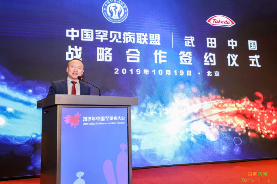 中国罕见病联盟执行理事长李林康先生致辞 在2019-2022年期间,双方将重点围绕以下领域开展合作,逐步推进各项工作的落地实施,长期推进罕见病诊疗工作的发展: • 诊疗能力建设:促进疾病筛查和诊断,建立诊疗和患者管理标准化流程,建设区域性诊疗管理示范中心。 • 药学服务能力建设:加强药学服务能力建设,采取创新性服务模式(如罕见病药房),提升药品的患者可及性。 • 疾病教育:开展罕见病专业和科普宣传,提升大众人群、医务人员和政府机构对罕见病的重视和关注。 • 政策研究:开展政策、规范、最佳实践研究,例如国际罕见病战略规划和立法,创新性筹资和医保支付,短缺药品和罕见病用药保障等。 • 科研和临床研究能力提升:搭建国际合作平台,提升医院科研、临床和药物研发能力,支持国家罕见病登记系统的推进与完善。 “罕见病是人类面临的共同挑战,我们眼前的工作任重道远。” 武田中国总裁单国洪先生在合作仪式上说道,“我们很荣幸能与罕见病联盟达成长期战略合作伙伴关系,从科研创新,诊疗体系建设和治疗可及性等多个方面展开深入合作。武田秉承‘以患者为中心’的企业精神,致力于携手各方积极合作,共同解决罕见病患者在疾病诊疗等方面未被满足的紧迫需求。我们将携手提升罕见病防治与保障水平,为促进中国罕见病事业的发展做出切实贡献,助力实现‘健康中国2030’。”