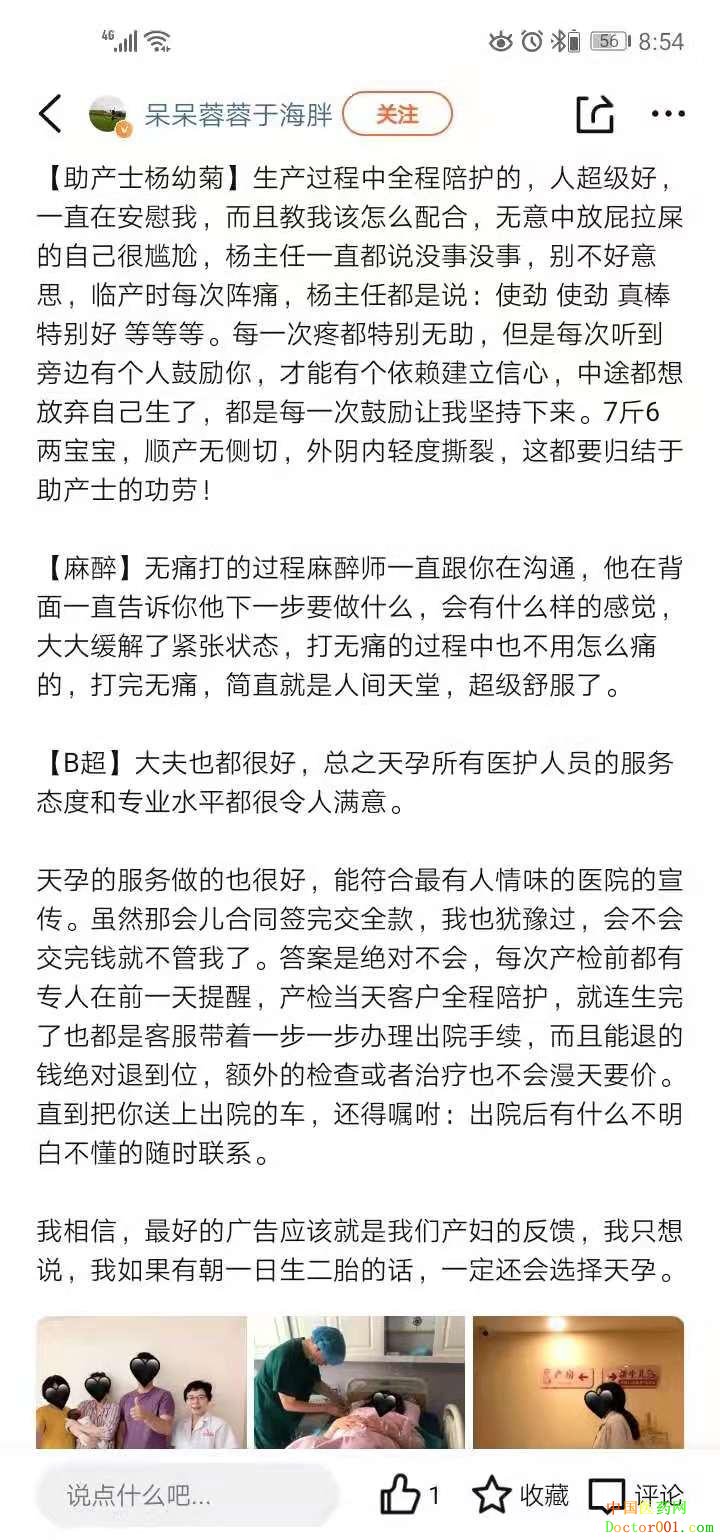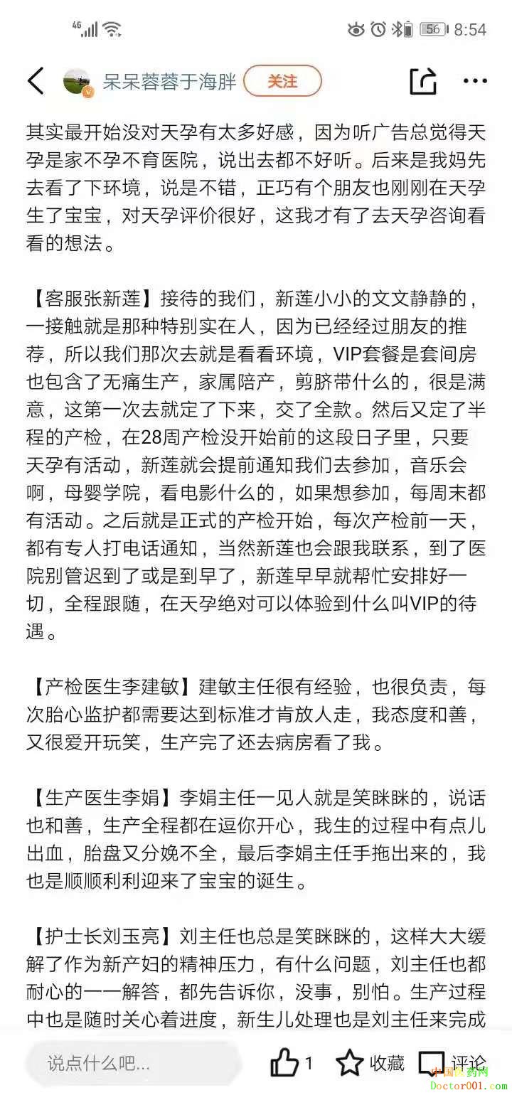 上一周的今天正在天孕医院催产,今天宝宝已经出生6天,不得不好好表扬一下天孕医院,在这里的生产体验我实在是太满意了! 从头讲起,检查是否怀孕先去的家门口的河西妇产,年轻的小护士抽血扎的人生疼,专业度就让我怀疑。后来确定怀孕了,又去中心妇产做检查,那排队的架势和大夫们的态度真的不敢恭维,专科医院,大夫们每天见的病人太多,可以理解,但是这都坚定了我去私立医院生宝宝的决心。虽然身边也有好多朋友在劝,还是公立好,接触的病人多,大夫有经验,一旦有紧急问题都好处理等等,但我坚信我能顺产,身体素质也好,不会有大问题的,即便有问题私立医院也是医院,肯定都有相应的解决方都没法。 然后就开始私立医院的选择,其实四维是在坤如玛丽照的,但是拍照过程中就遇见一个刚生完孩子的产妇和医院闹纠纷,说是哪个工作人员服务不好,刚生完孩子交完钱态度就全变了!然后...坤如就pass了.... 又去了美中宜和,可能因为是过年期间去咨询的,医院异常冷清,看了房间,是不小,但是非套间的价格已经超出了我的预算,听了介绍,说是医院大夫都是40左右的中年团队,因为这样的大夫比较有精力,但是我会对他们的经验打一个问号,还有更大的一个问号就是这群四十左右的大夫如果真的那么好谁会从公立大医院出来呢,看了简介后,确实如此,大夫很少有咱们天津专科大医院出来的,所以感觉也并非是物有所值。然后…美中也pass了... 其实最开始没对天孕有太多好感,因为听广告总觉得天孕是家不孕不育医院,说出去都不好听。后来是我妈先去看了下环境,说是不错,正巧有个朋友也刚刚在天孕生了宝宝,对天孕评价很好,这我才有了去天孕咨询看看的想法。 【客服张新莲】接待的我们,新莲小小的文文静静的,一接触就是那种特别实在人,因为已经经过朋友的推荐,所以我们那次去就是看看环境,VIP套餐是套间房也包含了无痛生产,家属陪产,剪脐带什么的,很是满意,这第一次去就定了下来,交了全款。然后又定了半程的产检,在28周产检没开始前的这段日子里,只要天孕有活动,新莲就会提前通知我们去参加,音乐会啊,母婴学院,看电影什么的,如果想参加,每周末都有活动。之后就是正式的产检开始,每次产检前一天,都有专人打电话通知,当然新莲也会跟我联系,到了医院别管迟到了或是到早了,新莲早早就帮忙安排好一切,全程跟随,在天孕绝对可以体验到什么叫VIP的待遇。 【产检医生李建敏】建敏主任很有经验,也很负责,每次胎心监护都需要达到标准才肯放人走,我态度和善,又很爱开玩笑,生产完了还去病房看了我。 【生产医生李娟】李娟主任一见人就是笑眯眯的,说话也和善,生产全程都在逗你开心,我生的过程中有点儿出血,胎盘又分娩不全,最后李娟主任手拖出来的,我也是顺顺利利迎来了宝宝的诞生。 【护士长刘玉亮】刘主任也总是笑眯眯的,这样大大缓解了作为新产妇的精神压力,有什么问题,刘主任也都耐心的一一解答,都先告诉你,没事,别怕。生产过程中也是随时关心着进度,新生儿处理也是刘主任来完成的。 【助产士杨幼菊】生产过程中全程陪护的,人超级好,一直在安慰我,而且教我该怎么配合,无意中放屁拉屎的自己很尴尬,杨主任一直都说没事没事,别不好意思,临产时每次阵痛,杨主任都是说:使劲 使劲 真棒 特别好 等等等。每一次疼都特别无助,但是每次听到旁边有个人鼓励你,才能有个依赖建立信心,中途都想放弃自己生了,都是每一次鼓励让我坚持下来。7斤6两宝宝,顺产无侧切,外阴内轻度撕裂,这都要归结于助产士的功劳! 【麻醉】无痛打的过程麻醉师一直跟你在沟通,他在背面一直告诉你他下一步要做什么,会有什么样的感觉,大大缓解了紧张状态,打无痛的过程中也不用怎么痛的,打完无痛,简直就是人间天堂,超级舒服了。 【B超】大夫也都很好,总之天孕所有医护人员的服务态度和专业水平都很令人满意。 天孕的服务做的也很好,能符合最有人情味的医院的宣传。虽然那会儿合同签完交全款,我也犹豫过,会不会交完钱就不管我了。答案是绝对不会,每次产检前都有专人在前一天提醒,产检当天客户全程陪护,就连生完了也都是客服带着一步一步办理出院手续,而且能退的钱绝对退到位,额外的检查或者治疗也不会漫天要价。直到把你送上出院的车,还得嘱咐:出院后有什么不明白不懂的随时联系。 我相信,最好的广告应该就是我们产妇的反馈,我只想说,我如果有朝一日生二胎的话,一定还会选择天孕。
