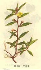 | 【标题】 丁香蓼 【拼音】 Dīnɡ Xiānɡ Liǎo 【拉丁文】 Ludwigia prostrata Roxb. 【异名】 丁子蓼、红豇豆、喇叭草、水冬瓜、水丁香、水苴仔、水黄麻、水杨柳、田蓼草、红麻草、银仙草、田痞草、水蓬砂、水油麻、山鼠瓜、水硼砂 【性味】 味苦;性寒 【功效】 清热解毒;利尿通淋;化瘀止血。主肺热咳嗽;咽喉肿痛;目赤肿痛;湿热泻痢;黄疸;淋痛;水肿;带下;吐血;尿血;肠风便血;疔肿;疥疮;跌打伤肿;外伤出血;蛇虫、狂犬咬伤 【药用】 为柳叶菜科植物丁香蓼的全草。 【用法用量】 内服:煎汤,15-30g;或泡酒。外用:适量,捣敷。 【形态】 一年生草本,高40-60cm。须根多数;幼苗平卧地上,或作倾卧状,后抽茎直立或下部斜升,多分枝,有纵棱,略红紫色,无毛或微被短毛。叶互生;叶柄长3-8mm;叶片披针形或长圆状披针形,长2-8cm,宽1-2cm,全缘,近无毛,上面有紫红色斑点。花两性,单生于叶腋,黄以,无柄,基部有小苞片2;萼筒与子房合生,萼片4,卵状披针形,长2.5-3mm,外略被短柔毛;花瓣4,稍短于花萼裂片;雄蕊4;子房下位,花柱短,柱头单一,头状。蒴果线状四方形,略具4棱,长1-4cm,宽约1.5mm,稍带紫色,成熟后室背不规则开裂;种子多数,细小,光滑,棕黄色。花期7-8月,果期9-10月。 【生态环境】 生于田间、水边、沟畔湿处及沼泽地。 【产地】 分布于江苏、安徽、浙江、江西、福建、台湾、湖北、湖南、四川、贵州等地。 【显微特征】 茎横切面:表皮为1列类方形细胞组成,外被单细胞非腺毛,并有5个向外突起的棱角。皮层窄。外侧2-3列细胞为厚角组织,内侧3-4列细胞形大,壁薄;近内皮层有少数纤维散在,壁厚木化。内皮层明显。韧皮部窄。木质部导管单个或2-3个相聚散在,壁木化;射线宽1-2列细胞。贿财薄壁细胞类圆形,贿中部常中空。本品薄壁细胞含少数草酸钙方晶。 叶横切面:上、下表皮均为1列类长方形细胞组成,外被非腺毛及腺鳞。栅栏组织不通过中脉,海绵组织排列疏松。主脉维管束外韧型,韧皮部窄;木质部导管呈放射状排列。主脉上,下表皮内侧有数列厚角细胞,薄壁细胞含草酸钙针晶,簇晶。 【化学成分】 本品含没食子酸(gallic acid)和诃子次酸三乙酯(triethylchebulaie)。 【理化鉴别】 取本品粉末1g,加乙醇15ml,回流30分钟,冷却,滤过。滤液供下列试验:1.取滤液少许,滴于滤纸上,喷以0.1%溴酚蓝的乙醇溶液,在蓝色背景上显黄色斑点。(检查有机酸)。 2.取滤液1ml,滴加1%三氯化铁溶液1滴,显蓝黑色。(检查没食子酸) 【药理作用】 丁香蓼水提取物去除鞣质后分离得到没食子酸和诃子次酸三乙酯,体外抗菌试验证实对宋内、舒氏、鲍氏、志贺等痢疾杆菌及金葡球菌、绿脓杆菌等有较好的抑菌作用。 【采收加工】 秋季结果时采收,切段,鲜用或晒干。 【附方】 本品喜生水田、水边,花及子房形态与丁香相近,全草类蓼,蒴果颇似胡麻,胡麻又称油麻,因而有水丁香、丁香蓼、田蓼草、水油麻诸名。 【图片】 丁香蓼 ![]() (责任编辑:Doctor001) |