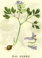 | 【标题】 东北延胡索 【拼音】 Dōnɡ Běi Yán Hú Suǒ 【拉丁文】 1.CorydalisambiguaCham.etSchlecht.[C.ambiguaCham.etSchlecht.var.amurensisMaxim.]2.CorydalisrepensMandl.etMuhld.[Pistolochiarepens(Mandl.etMuhld.)Sojak] 【异名】 延胡索、蓝花菜、蓝花豆。 【性味】 辛;苦;温 【归经】 肝;胃经 【功效】 活血;散瘀;理气;止痛。主心腹腰膝诸痛;痛经;月经不调;产后瘀滞腹痛;崩漏;瘤瘤;跌打损伤 【药用】 为罂粟科植物东北延胡索或全叶延胡索的块茎。 【注意】 孕妇禁服。 【用法用量】 内服:煎汤,3-9g,研末,1.5-3g;或研末入丸、散。 【形态】 1.东北延胡索 多年生草本,无毛,高15-25cm。块茎球状,单一,直径8-15mm,断面白色至淡黄色。茎软弱,单一,近基部具鳞片1枚;自鳞片腋常3-4分枝,叶具细柄,叶片灰绿色二回3出全裂,一回裂片有明显的柄,末回裂片无柄或具短柄,长椭圆形至倒卵形,长1-3cm,有时分裂,先端钝圆。总状花序顶生,疏生花8-20朵;苞片披针形至椭圆形,长5-15mm,全缘或下部者略有栉齿状分裂;花梗长15-20mm;萼片不明显;花冠长15-35mm,淡蓝色至蓝紫色,外轮瓣片全缘,无突尖,距粗而直,蜜腺体贯穿距长的1/2。蒴果条形,长18-25mm,宽2-3mm,干后略呈串珠状。种子多数,卵形至椭圆形,直径约1.5mm,深褐色。花期4-5月,果期4-6月。 本种有3个变型,分布、用途均与原种基本相同:①线裂东北延胡索CorydalisambiguaCham.etSchecht.f.lineariloba(Maxim.)C.Y.WuetZ.Y.Su叶末回裂片条形或条状长圆形。②圆裂东北延胡索C.ambiguaCham.etSchlecht.f.ro-tundiloba(Maxim.)Kitag.叶末回裂片具短柄,近圆形,先端具栉齿或全缘。③栉裂东北延胡索C.ambiguaCham.etSchle-cht.f.pectinata(Kom.)Kitag.叶末回裂片楔形,栉齿状分裂。 2.全叶延胡索 多年生草本,无毛,高8-22mm。块茎球形至倒圆锥形,直径10-30mm,有时瓣裂为3-6枚,外被枯萎栓皮若干层,断面白色至浅黄色。茎斜卧,单一,自下部1枚鳞片起作2-5分枝。叶具柄;叶片三回3出全裂,末回裂片椭圆形或倒卵形,长6-25mm,宽5-6mm,全缘,稀先端浅或深裂。总状花序顶生,疏生花4-10朵;苞片披针形至卵形,中、下部者常中裂,上部者全缘;花梗纤细,长约20mm;花瓣浅蓝色至紫红色,外轮上花瓣长12-19mm,瓣片先端2浅裂,无短尖,全缘,距较瓣片略长;柱头具4乳突。蒴果卵形至长卵形,长10-15mm,宽5mm,熟时下垂。种子2列,扁肾圆形,黑色。花期4月,果期5月。 【生态环境】 1.生于杂木疏林下、林缘、阴湿沟边。 2.生于海拔700-1000m的杂本疏林下或林缘。 【产地】 1.分布于东北地区,以东部较多。 2.分布于东北及河北、山东、江苏、安徽、浙江、河南等地。 【化学成分】 1.东北延胡索 块茎含左旋的紫堇碱(cory-daline).紫堇达明碱(corydalmine).消旋四氢掌叶防己碱(te-trahydropalmatine).原阿片碱(protopine),去氢紫堇碱,左旋四氢非洲防己碱(tetrahydrocolumbanime),消旋四氢黄连碱(te-trahydocoptisine),左旋四氢黄连碱,黄连碱,去氢紫堇达明碱,卡文定碱(cavidine),α-别隐品碱(α-allocryptopine),消旋甲基紫堇杷灵(methylcorypalline),去氢岩黄连碱(dehydrothalictrifo-line)及白元胡碱(ambinine)等生物碱。 2.全叶延胡索 块茎含原阿片碱,比枯枯灵碱(bicu-culline),左旋金罂粟碱(stylopine),左旋斯氏紫堇碱(scouler-ine),华紫堇碱(cheilanihifolin),紫堇碱,黄连碱(cophsine),海罂粟碱(glaucine),掌叶防己碱(palmatine)等生物碱。 【理化鉴别】 薄层色谱:取本品粗粉约1.0g,甲醇回流提取2小时,回收甲醇,残渣用甲醇定容至1ml作样品液,并以延胡索乙素甲醇溶液(1mg/ml)为对照液。取样品液和对照液各3μl分别点样于同一硅胶G薄层板上,以正己烷-氯仿-甲醇-二乙胺(5:3:0.5:1日)展开15cm,取出,晾干,喷改良碘化铋钾试液,样品色谱在与对照品色谱相应的位置上,应显相同橘红色斑点。另取一硅胶G-CMC薄层板,点样品液及去氢紫奠碱甲醇溶液(1mg/ml)各3μl,以氯仿一甲醇(5:1,氨饱和下)展开10cm,取出,晾干,喷改良碘化铋钾试液,样品色谱在与对照品色谱相应的位置,应显相同颜色的斑点。 【药理作用】 1.抗溃疡作用 东北延胡索全碱对幽门结扎性溃疡、应激性溃疡、阿司匹林性溃疡、ACTH性溃疡的抑制率分别为60%、40.7%、43.3%、51.5%,能非常显着的抑制胃液分泌,非常显着的降低胃液游离酸度,对胃蛋白酶活性也有降低趋势。 2.镇痛、镇静及抗惊作用用东北延胡索粗提取物9g/kg灌胃,对小鼠无显着镇痛(甩尾法、热板法)、镇静和抗惊(电刺激)作用(P>0.05)。 【采收加工】 5-6月挖取块茎,去外皮,用开水煮至内部变黄,晒干。 【性状】 1.性状鉴别 (1)东北延胡索 块茎球形、扁球形或长球形,直径5-10mm。表面黄色或黄棕色,无明显皱纹;上端微凹处有茎痕,底部可见不定根痕。质较硬,断面白色或黄白色。气微,味较苦。 (2)全叶延胡索 块茎扁球形或球形,直径5-10mm。表面黄色或黄棕色,无明显皱纹;上端微凹处有茎痕,底部可见不定根痕。质较硬,断面白色至淡黄色。气微,味较苦。 2.显微鉴别 粉末特征:(1)东北延胡索 黄白色或淡黄色。①淀粉粒以复粒为多,分粒易散离。单粒类圆形,直径5-22μm,脐点明显,大多点状、星状、短缝状,大粒层纹明显;复粒由2-5(-6)分粒组成,以2-4分粒为多见,少数复粒的一分粒较小,大分粒可见层纹。②下皮厚壁细胞成片,黄绿色,长条形或类长方形,一端边缘不平整,直径27-63μm,长约至360μm,壁厚3-5μm,木化,纹孔短缝状,大多横向分布,较稀疏,孔沟细,疏密不均匀。③皮层厚壁细胞多单个散在,黄绿色,类长方形或类方形,直径45-81μm,长72-153-225μm,壁厚5-9μm,木化,