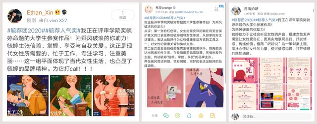 破圈:校园KOL变身品牌传声筒 在学院奖的活动中,毓婷以年轻群体对品牌的思考为前置,更多时候将自己处于提问与倾听者的角色之中,让年轻人发挥最大的主动权。除了内容共创,毓婷还借力打力,以流量思维率先圈住最具代表性的校园KOL,让他们成为品牌的“信使”,用最贴合年轻群体的方式吸引更多圈层的人加入共创的阵营,实现圈层突围。 2019年,毓婷首次启动大学生评委制度,成立代表毓婷品牌的学生KOL组织——“毓荐团”,从大学生视角出发选拔优秀创意作品,评定“毓荐人气奖”。这也是毓婷首次将大学生纳入评委体系。这一限定团体带着品牌的力量成功“出道”,在大众的见证下成为了毓婷的首批“校园代言人”。今年,毓婷在此基础上延续了毓荐团制度,在全新的文化语境中建立连接品牌与学生的多重场景,为品牌触达更广泛的年轻消费群提供更多可能性。 成团邀约发出后,同学们快速响应,经过层层筛选最终来自80余所高校的学生KOL组成毓荐团,成员粉丝量总计近50万。校园KOL在各领域的纵深影响力,成为毓婷引爆校园流量的引擎,学生评委们不仅以犀利独特的视角甄选符合年轻人潮流趋势的创意作品,更以己之力带动传播声量,为毓婷品牌扎根校园提供最强助力。