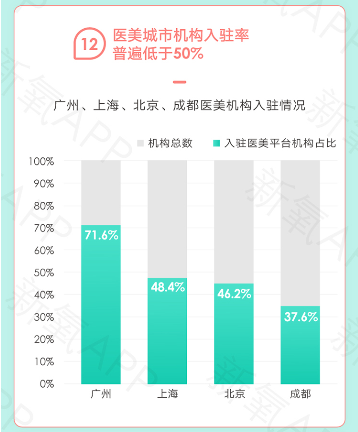 新氧选取中国医美发展最成熟的4个城市开展调研,发现:广州合规医美机构250多家,入驻医美平台机构数179家,入驻率高达71.6%;上海合规医美机构310家,入驻医美平台机构数约150家,入驻率达48.4%;北京合规医美机构600余家,入驻医美平台机构数277家,入驻率达46.2%;成都合规机构450家,入驻医美平台机构数169家,入驻率仅37.6%。由此可见,一二线城市医美机构线上入驻率普遍低于50%,这也拉低了消费者的在线求美体验。