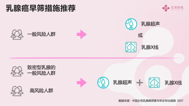 医准智能新品发布会现场 乳腺癌成全球癌症首位高负荷影像诊断工作来袭 全球范围内,乳腺癌是女性最常见的恶性肿瘤之一,是全球女性健康第一杀手;世界卫生组织国际癌症研究机构发布的 2020 年全球最新癌症负担数据显示,乳腺癌取代肺癌,已成为全球第一大癌症。在我国,乳腺癌的年平均增长率约为3.5%,发病率增速全球第一。 早期筛查是提高乳腺癌治愈率的最重要手段。依据2021版《中国女性乳腺癌筛查与早诊早治指南》提示,针对45 岁-70 岁的一般风险人群,应1 -2 年进行一次乳腺超声或乳腺X线筛查。针对致密性乳腺的一般风险人群或高风险人群,宜从40岁开始每年应进行一次乳腺超声联合乳腺 X 线摄影检查。但我国医疗资源分布不均、基层医疗资源缺乏,高负荷影像诊断工作致使乳腺癌早筛诊断能力和效率都受到挑战。为了提高乳腺癌筛查效率及准确率,减小误诊风险,针对人工智能技术的辅助诊断系统需求愈加强烈。