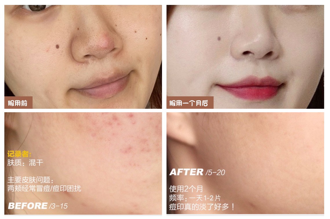 产品通过了严格的澳洲TGA认证,品质有保障,安全无副作用。每天2次,一次1片,从内根源调理肌肤。 1-2周 消除炎症,加速促进肌肤伤口愈合 3-4周 淡化痘印颜色,平滑肌肤 4-6周 磨平痘印,调理肌肤健康,肌肤焕然新生
