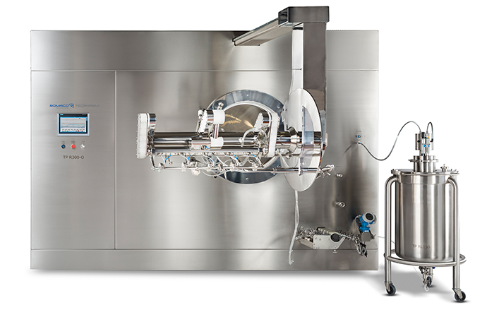 The TP R Optima perforated coating pan from Romaco Tecpharm coats tablets in totally variable batch sizes from 10 to 100%. All processes can be automatically adjusted without having to open the machine and intervene manually. In order to switch from pilot to production scale, it is sufficient to call up the relevant parameters on the HMI and start the process. Thanks to this highly automated technology, there is no need for the operator to be continuously present while working in batch mode. Intelligent spray arm with movable nozzles The TP R Optima tablet coater’s very wide range of applications is a result of its innovative design with an extendable spray arm and movable spray nozzles. This patented system has a large radius owing to its three-point extension mechanism, so that the ideal spray distance – and hence very high product quality – is maintained no matter how small the batch size. The application of the spray liquid is automatically controlled and monitored with the help of sonar measuring equipment. The sonar’s acoustic wave sensors measure not only the batch volume but also the tablet bed inclination, which varies according to the turning speed of the drum. In addition to adjusting the spray distance based on this data, the intelligent system aligns the spray nozzles exactly, so that the tablets are coated at the correct distance and angle throughout the entire process. Flow conditions flexibly controlled Besides the spray distance and angle, the flow conditions in the drum are decisive for optimum coating results. The TP R Optima coater was therefore designed with automatically controllable air exhaust flaps that can be opened continuously and are mounted at various heights. As a result, the path taken through the tablet bed by the air flow and spray liquid can be regulated absolutely precisely, regardless of the batch size. The controlled exhaust air flow ensures loss-free application of the suspension, in other words the coating does not simply run over the product before being discharged again unused. The precision with which the flow conditions and the vacuum are controlled inside the drum makes for a very efficient spraying and drying process. Apart from shorter processing times, this simultaneously reduces coating liquid consumption by up to 60%. This significant time and material saving equates to lower manufacturing costs and a more sustainable production process. High process control The TP R Optima tablet coater provides another important instrument for process control, namely automatic detection of clogged spray nozzles. Especially when processing highly viscous coating media, there is a risk of nozzle blockage. If such blockages occur, the system immediately identifies the nozzle in question and attempts to restore the flow with overpressure. An alarm is tripped if this fails. The user can specify in advance in the system whether the process should continue or be stopped directly in such a case (which usually depends on the product). Besides, the sampling that is required at regular intervals likewise takes place fully automatically without needing to open the drum in order to remove the tablets. Pharmaceutical-grade GMP design