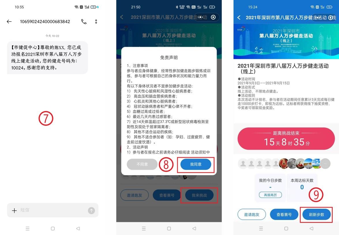 7、报名成功,将会收到短信通知。 8、进入我的活动,点击“我来挑战”,点击“我同意”同意活动声明。 9、若在活动页面看不到“我的今日步数”,记得刷新自己的步数哦。