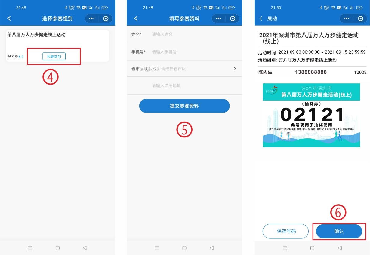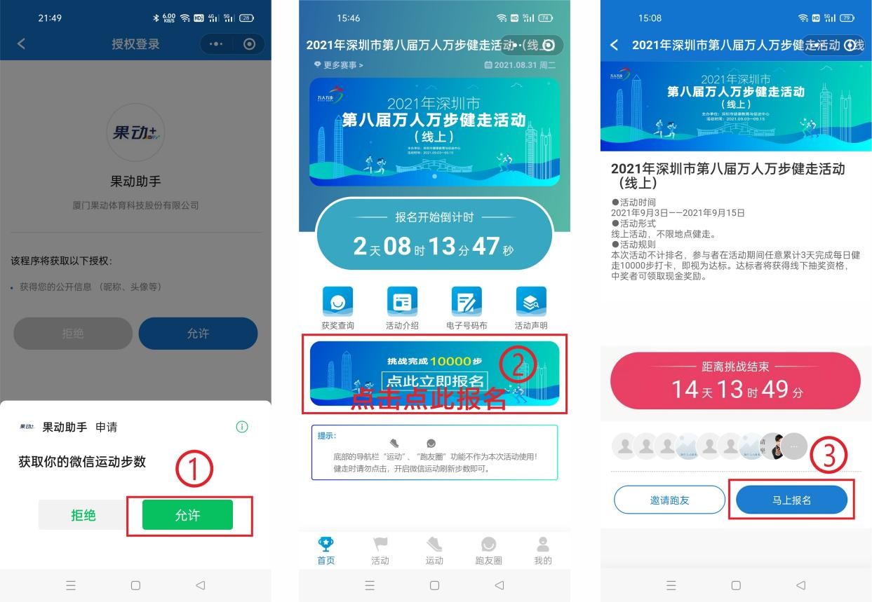 ●活动名称 2021年深圳市第八届万人万步健走活动(线上) ●主办单位 深圳市健康教育与促进中心 ●活动时间 2021年9月3日——2021年9月15日 ●活动形式 线上活动,不限地点健走。 ●活动规则 本次活动不计排名,参与者在活动期间任意累计3天完成每日健走10000步打卡,即视为达标。达标者将获得线下抽奖资格,中奖者可领取现金奖励。 ●报名费用 免费,不收取任何费用。