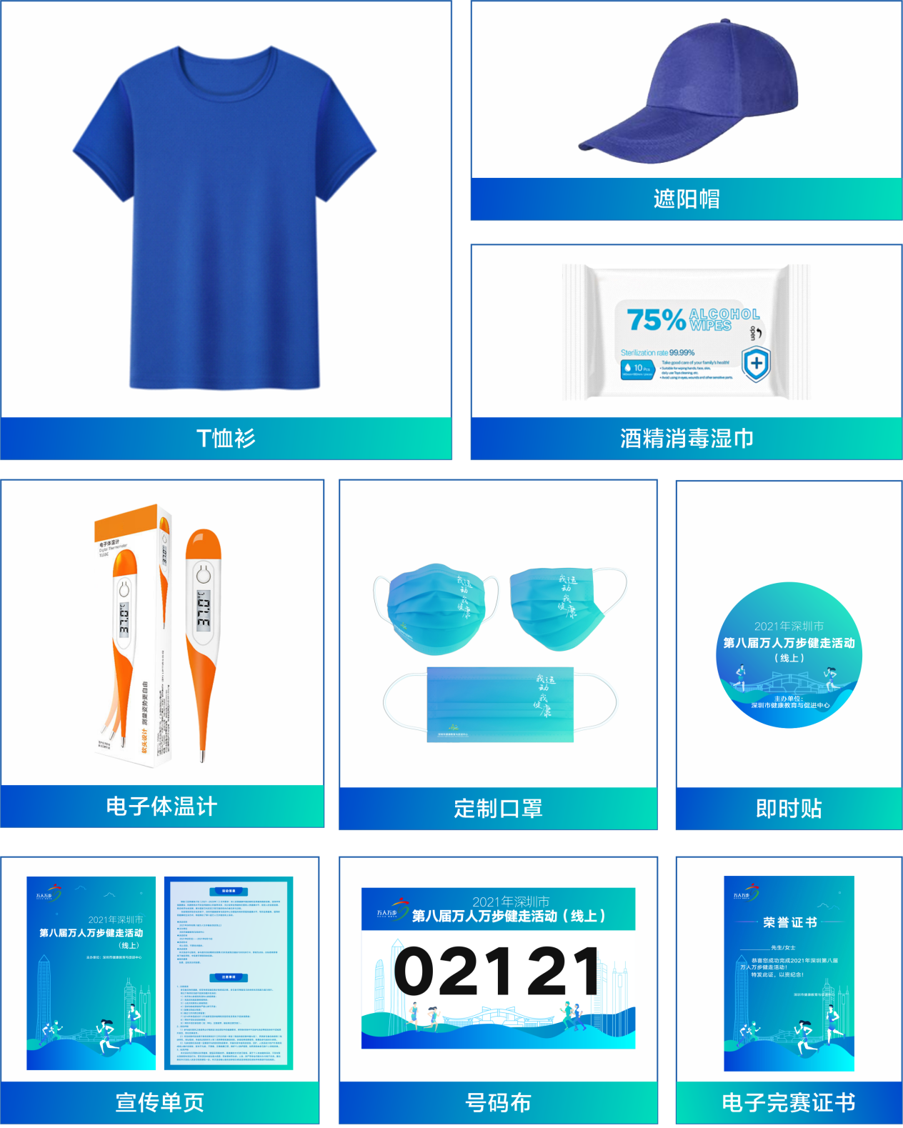 一、参与奖 报名成功后填写个人资料可获得活动礼品一份(包含有:T恤衫、遮阳帽、电子体温计、酒精消毒湿巾、定制口罩、宣传单页、号码布、即时贴)。 (注:因数量有限,仅限前3000名报名成功者有礼品!礼品随机发放,不可更换。) 所有参与者在活动期间只要成为达标者,就可以获得个人电子版完赛证书。