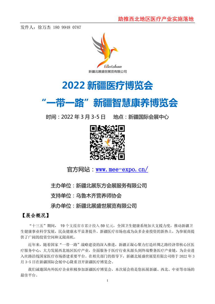 2022新疆医疗博览会邀请函3月3-5日 时间:2021-09-14 11:22 来源:媒体投稿 作者:Doctor001 点击:次 分享到:QQ空间微信新浪微博腾讯微博人人网 官方网站:http://www.mee-expo.cn/ (责任编辑:Doctor001) 上一篇:第6届广州国际生物技术大会暨展览会盛大开幕! 下一篇:2021第6届广州国际生物技术大会暨展览会圆满落幕