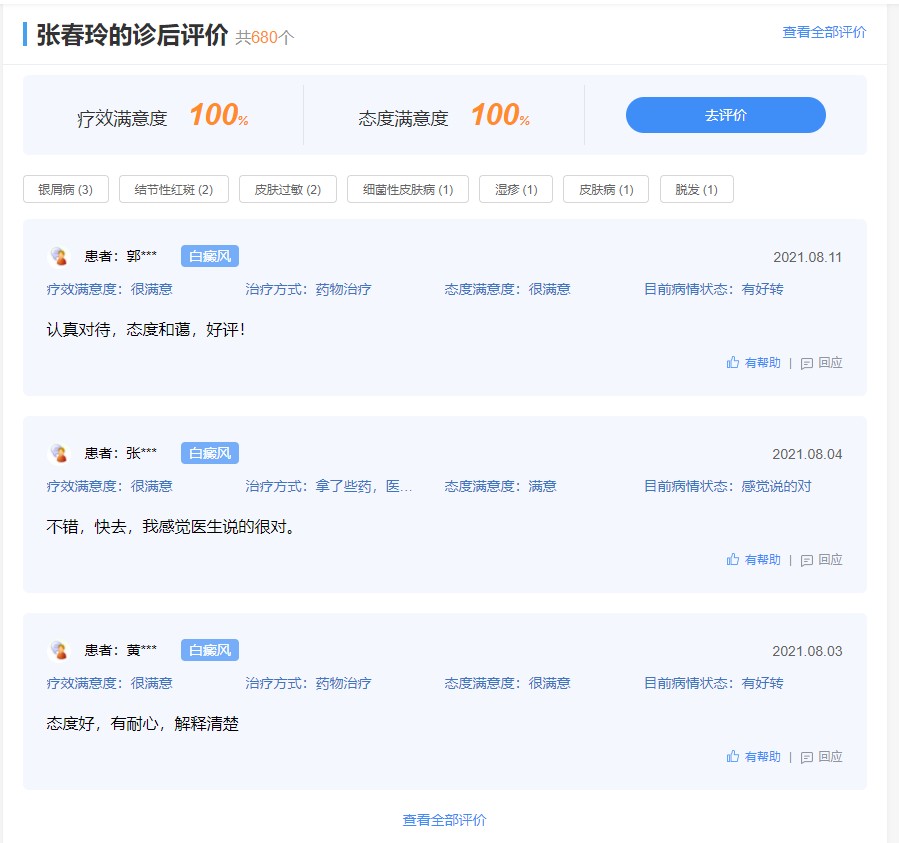 张春玲/主任医师/副教授 张春玲,女,主任医师,知名专家。1987年毕业于北京大学医学部(原北京医科大学),1999年获北京协和医科大学皮肤性病专业硕士学位,从业于皮肤性病科临床工作30年,有较丰富的门诊和病房工作经验。中国中西医结合学会皮肤病分会激光美容专业委员。