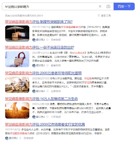 网络搜索“罕见病目录影响力”健识局文章排名均居前列 调研开展过程中,健识局得到了来自医疗一线的顶尖专家、罕见病药物科研带头人、中外优秀企业代表、社会公益组织等方方面面的帮助。全行业的无私分享,才使健识局能够全方位地梳理罕见病防治这个宏大的话题。