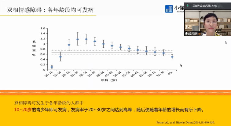 此外,双相障碍各年龄段均可发病。广东省人民医院心理精神科戚元丽教授在会议上说道:“10~20岁的青少年即可发病,发病率于20~30岁之间达到高峰,随后便随着年龄的增长而有所下降。”