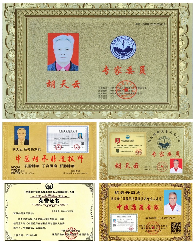 胡天云主任祖辈是世代中医,在战乱时期由江西行医到广西桂林市兴安县并落户。他出身中医世家,自幼耳濡目染、酷爱中医。 1968年-1975年在家传老中医师胡家字、胡冒明祖医师教诲下,刻苦学习中医理论基础知识,学习中医药性,中医配剂,脉决学,学习《伤寒论》,学习内科疾病诊断学,学习乳腺增生,子宫肌瘤,妇儿科学,肝腹水,肝肺肿瘤辨症诊断学。 1976年-1978年跟随鼻星泰金旺老中医学习跌打损伤,骨伤接骨扶正手法,无名肿毒,烫伤科熬膏制做技术,快速解决消肿疼痛一系列临床运用。 1980年一1983年跟大姨夫阳宝君老中医深造学习疑难杂症,皮肤疾病,蛇伤科医治排毒技术。 1979年在县中医院参加中医考试,荣获个体医生行医证书。 1980年在家传中医诊所坐诊看病、号脉、开处方。 1993年-2011年在父亲战友的医院中指导中医与配剂临床技术操作。 2015年接受中国东方栏目新闻关注CCTV新闻见证并颁发胡氏诊所匾牌证书。 2017年参加广州基层培训、中医临床操作、实践和荣获中华特色名医荣誉证书。 2019年荣获北京百年浩瀚中医研究院、中医肿瘤肝病专家荣誉证书并颁发牌匾。 2020年荣获中华人民共和国卫生健康专家委员、华医健康顾问副主任委员证书并颁发牌匾。 2021年荣获中国管理科学研究院、中医药产业研究中心研究员荣誉证书。 2021年元月经上级批准需要,中国民族卫生协会培训部会议同意,由胡天云任基地主任,设立批复《中医康复理疗技术传承培训基地》并开展日常工作。