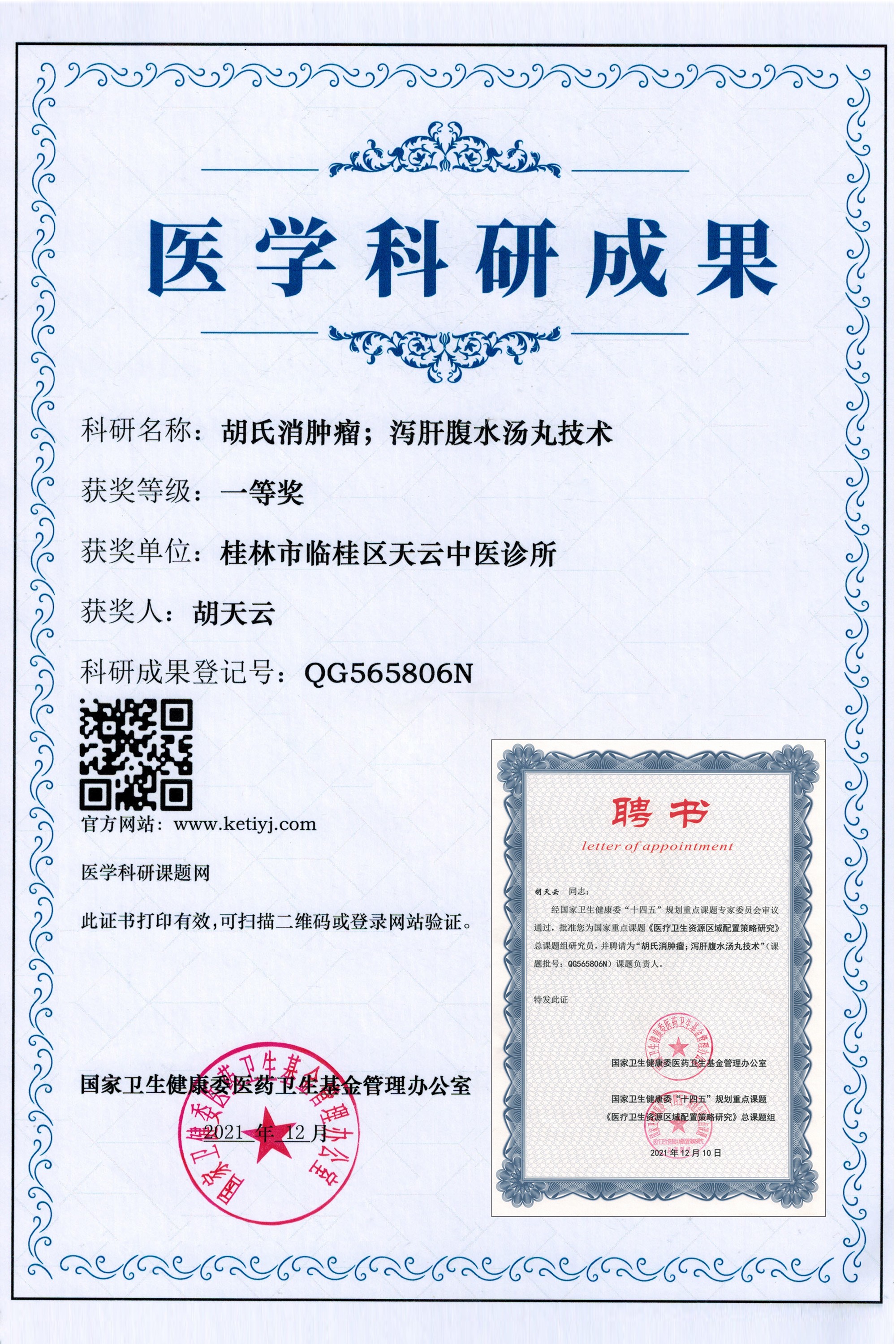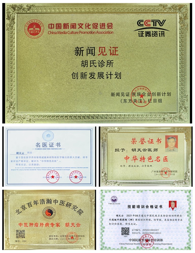 胡天云主任继承祖辈传承医学,运用阴阳五行、四诊八纲、五脏六腑,结合人体八大系统原理诊断疾病,擅长运用中草药治疗:肝肿瘤,肺肿瘤早中期,肝腹水,乳腺结节,乳腺肿瘤,子宫糜烂,子宫肌瘤、癌症,风湿,类风湿,肩周炎,腰椎间盘实出,坐骨神经痛等疾病。他所研发的胡氏消肿瘤、泄肝腹水汤丸技术受到了国家卫生健康委医药卫生基金管理办公室的认可,并颁发医学科研成果证书,科研成果登记号:QG565806N,自配的其他清热解毒祛湿水及消肿止痛等中药方剂,效果也非常显著。
