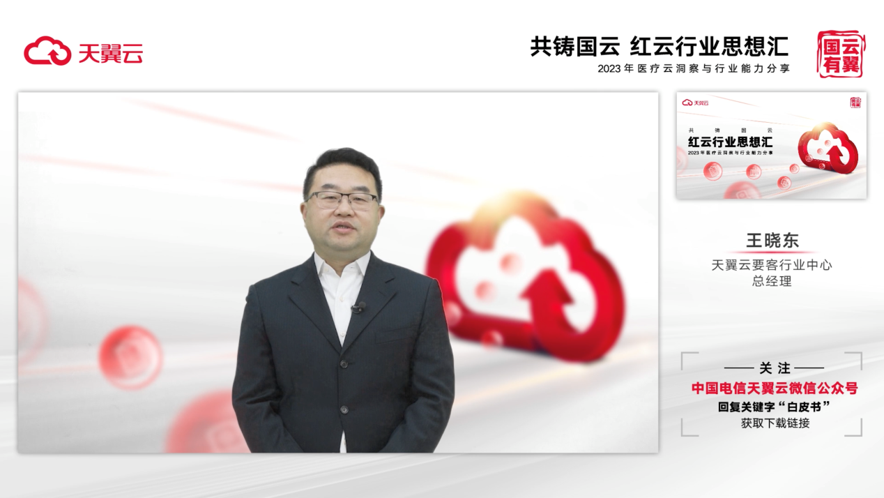加强技术创新 协同伙伴共推医疗数智转型 为了更好地助力各地医疗机构上云,天翼云携手合作伙伴加强协同创新,打造更加丰富多态的云产品和专业的解决方案,提升民众就医便利,加速智慧医疗时代到来。 四川省泸州市泸县卫健局高级工程师郑兵在分享中表示,卫健局未来将与牵头医院、医疗机构、政务云平台形成一个混合云架构的县域医共体数据中心,这也大概率是医共体数据中心的终极形态。 东华医为科技有限公司解决方案中心咨询顾问王福霞介绍了东华医为和天翼云联合打造的iMedical Cloud方案即云HIS产品,是一个云化、安全、共享、协同的产业互联网云生态IT平台,其核心功能是业务云协同和数据云协同。 会上,天翼云要客行业中心总经理王晓东表示,天翼云基于对行业现状的研究和未来发展趋势的预测,提取了医疗云发展过程的3大关键词,即分布与集约相融合、敏态与稳态相统一、优化与合作相呼应。