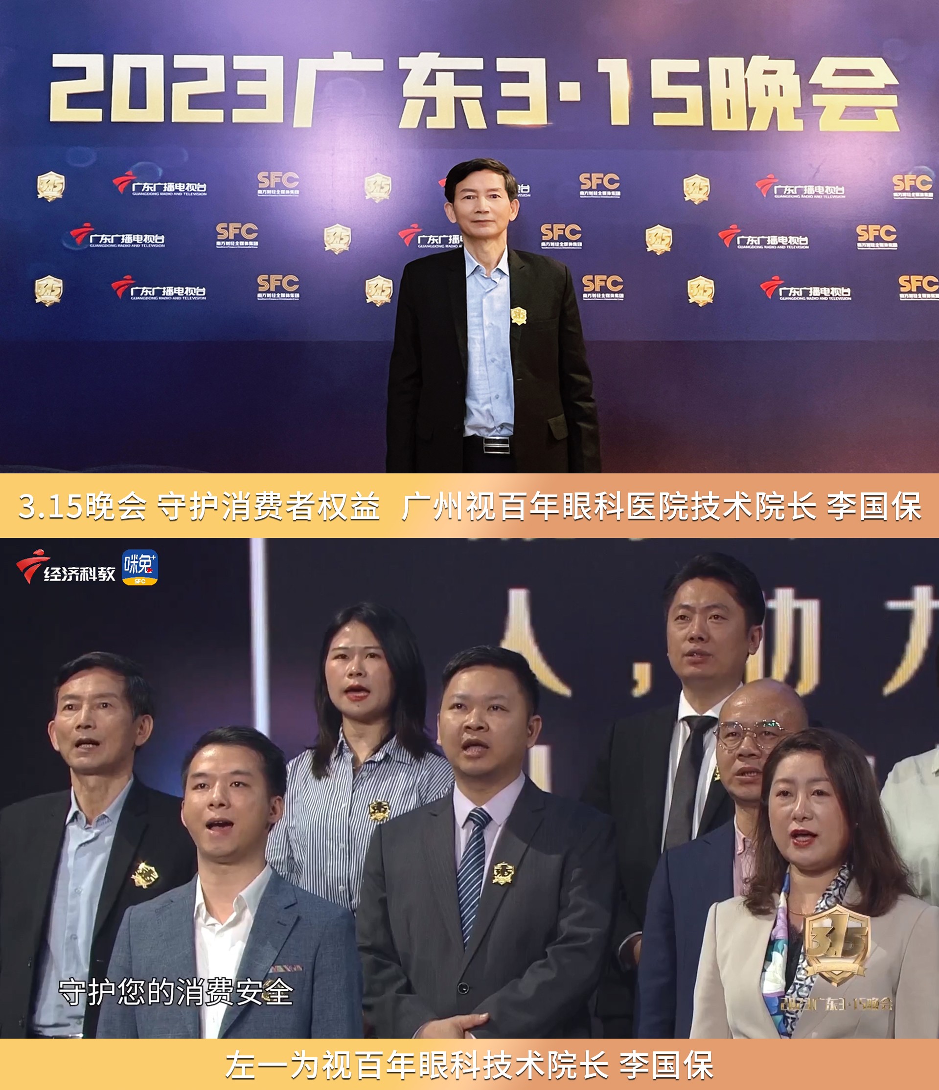 | 2023广东315晚会于3月14日20:00播出,以"提振信心,放心消费”为主题,由广东广播电视台、南方财经全媒体集团联合主办,广东广播电视台、南方财经频道、广东经济科教频道共同播出,广州视百年眼科作为优秀企业代表受邀参加。