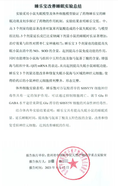 实验报告上的陈述 经中国科学院贵州省天然产物重点实验室测试,睡乐宝可升高Glu诱导的受损脑神经细胞存活率,降低脑神经细胞的凋亡,为失眠人群提供一个修复、保护脑神经细胞,促进深睡眠的通路。同时增加人体分泌 NO 、 SOD 的含量,起到提高免疫功能的作用,提高分泌伽马氨基丁酸及五羟色胺的含量,提高睡眠质量,增强海马组织中 IL -1B的 mRNA 的表达,从而起到提高失眠小鼠睡眠功能。因此,睡乐宝具有提高睡眠质量、延长睡眠时间,改善和修复受损神经元细胞,达到改善睡眠的作用。 因为是保护、修复脑神经细胞的活性和增加人体自我分泌NO 、 SOD、伽马氨基丁酸及五羟色胺,所以,睡乐宝不会让人产生依赖性,而是诱导出人体自发的睡眠机制。睡乐宝机理与单一解决失眠表象问题不同的是:它能复合型修复失眠,除了关注失眠本身的表象,同时也关注导致失眠的根本,综合调理,标本兼顾。同时,睡乐宝自主研发的失眠体质自测表,可针对现代人体质差异诊测出失眠体质的不同,针对性提供不同的解决方案,这一点也明显区别于市场上单一、无差别的外源性单方产品。 (责任编辑:Doctor001) |
