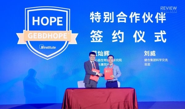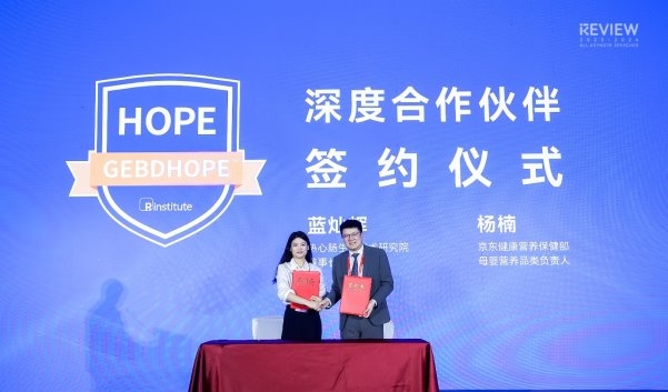 HOPE深度合作伙伴签约仪式 左:京东健康营养保健部母婴营养品类负责人杨楠;右:热心肠研究院董事长兼院长蓝灿辉