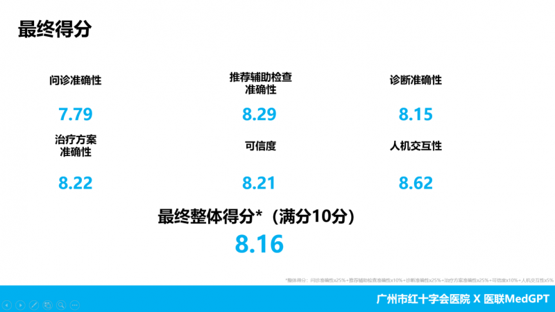 活动还特别设置了病历点评环节,由资深医疗专家对所有诊断病例进行深入剖析,并从问诊准确性、推荐辅助检查准确性、诊断准确性、治疗方案准确性、可信度、人机交互性等六个维度进行打分,最终MedGPT取得了8.16分(十分制)的好成绩,得到了专家们的一致好评。这一环节不仅是对AI医疗技术的一次实战检验,更是对医疗教学与科研的宝贵贡献,有助于培养更多具备AI应用能力的医学人才。