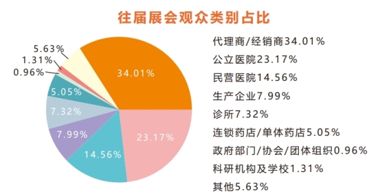四、专业观众邀约 (1)80%观众来自医院和渠道商 在已成功举办的各届医博会中,组委会通过积累丰富的行业客户资源,以及与各级医疗行业学会、协会、商会、行业媒体、行业平台等单位沟通合作, 专注于邀请参展商重点关注的专业买家到场参观、交流、采购。近年以来,各届医博会到场观众人次均保持在1.5万至2.5万,包括各级公立医院、民营医院、经销商、代理商、诊所、医疗器械生产厂家等专业观众类别,其中,医院和经销单位的到场客户比例占全部观众的80%以上。