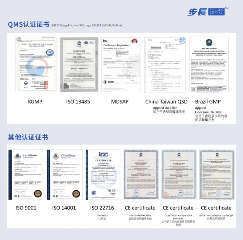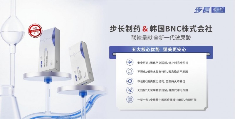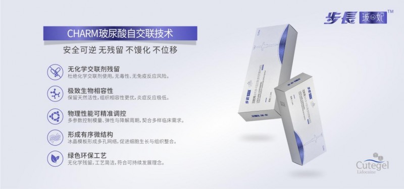 更深层的变革在于市场需求的迭代。消费者对透明质酸的期待,已从“物理填充” 升级为“精准塑形+肤质改善+长效抗衰”的复合诉求。2025年医美消费调研显示,68%的求美者认为“治疗舒适度”是选择产品的首要因素,57%关注“术后自然度与可逆性”,这直接推动了“无痛填充”“动态塑形”等技术方向的爆发。与此同时,非面部填充需求(如肩部、耳部、髋部、锁骨)以年均40%的速度增长,传统产品在大容量注射场景下的支撑力不足、扩散风险等问题愈发凸显,行业迫切需要技术更先进、适配场景更广泛的创新产品。 技术破壁:步长玻妃(Cutegel)的颠覆性创新与行业标准重塑 韩国BNC株式会社四款透明质酸产品的获批,并非简单的“新品入市”,而是代表着新一代透明质酸技术的全面落地,其核心在于以“安全+舒适+精准”三大维度重构行业标准。作为韩国最早上市的玻尿酸填充剂,BNC株式会社始终以“生物相容性材料创新”为核心,其CHARM玻尿酸自交联技术(高压、深冻)、透明质酸防黏连制剂技术已获全球多项专利,而此次进入中国的步长玻妃(Cutegel)系列,正是其十年技术沉淀的集大成之作。