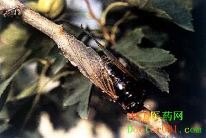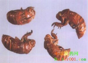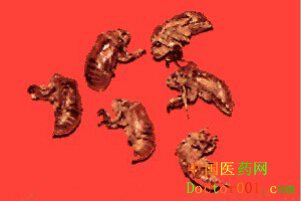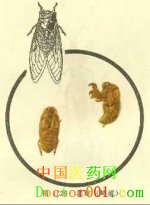 为蝉科昆虫黑蚱Cryptotympana pustulata Fabricius若虫羽化时脱落的皮壳。主产于山东、河北、河南、江苏等省。全国大部分地区亦产。夏、秋二季采集,除去泥士、杂质,晒干。生用。