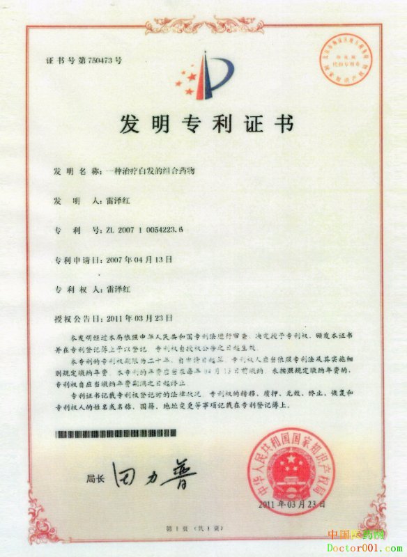 发明专利证书 她一直以来非常注重天然安全产品,她所研发的外用涂摸产品几乎都能入口,但唯独洗发水没有作到入口的地步。上天有眼,去年有幸遇到现年105岁依然健康豁达的英国剑桥任博士,结合他的一项生态净洗发明专利,终于实现了洗发水能入口的奇迹。更奇特的是,任博士的专利产品不仅能入口,更有特别的美容护肤效果。任博士长年都使用自己的产品洗脸洗澡刷牙,所以虽然年过百岁,居然没有一点老年斑,牙齿还非常坚固。现在结合雷泽红女士的功效型产品生产出了系列的家庭洗洁类产品。任博士也使用上了雷女士的专利产品,令多年的秃头已开始雨后春笋般地往外长头发了。