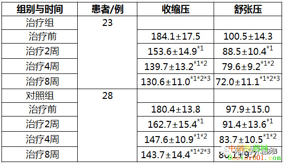 肾性高血压是肾病患者的常见并发症,高血压又是引起肾病患者肾功能减退的主要原因之一。由于肾性高血压病因的复杂,往往需要多药联用才能增加降压达标率。近来有研究证实,在部分慢性肾脏病患者中交感神经兴奋性过高是造成高血压难治的重要原因之一。 为观察氨氯地平联合比索洛尔治疗肾性高血压的疗效和安全性,彭澄等[1]研究证实氨氯地平联合比索洛尔治疗肾性高血压安全有效,疗效优于单用氨氯地平。 研究者将51例患者随机分成对照组28例和治疗组23例,对照组将氨氯地平加量至5.0mg,po,q12h,治疗组加用比索洛尔2.5mg,po,q12h,2周后若降压达到显效则维持剂量,若无效则剂量增加至5.0mg,qd,再服用6周至观察结束。所有患者均给药8周。 结果如下: