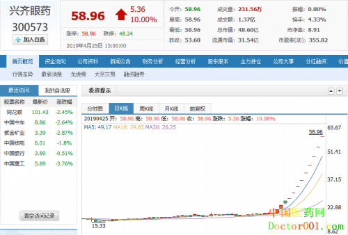 甚至在4月份的横盘调整中,眼健康概念个股兴齐眼药更是一枝独秀,哪怕在25日的股灾中,兴齐眼药依然坚挺,拿下了12天11个涨停板的记录,单股价格高达58.96元。 据了解,兴齐眼药是一家垂直眼健康行业的制药公司,其主要产品为眼科处方药物。2018年,公司实现营收4.31亿元,同比增长19.78%。实现归母净利润1365.87万元,同比下降65.37%。 据市场分析,此次兴齐眼药10连板的逻辑是基于4月10日公司发布业绩预告称,2019年1-3月归属上市公司股东的净利润60.03万至196.73万,同比变动123.46%至176.88%。公司预测,2019年第一季度公司营业收入较上年同期稳步增长,经营业绩较上年同比上升。 于此同时,兴齐眼药还拿下了国家药监局核准签发的盐酸奥洛他定滴眼液《药品注册批件》。该款滴眼液主要用于治疗过敏性结膜炎的体征和症状。 兴齐眼药能够取得惊人的10连板,更与市场大环境有着深层次关系。