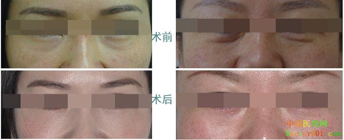 而采用眼袋外路手术+膨体充填,将雕刻好的膨体植入并缝合固定,切除多余的皮肤及眼轮匝肌,去掉眼袋的同时泪沟也被填平,整个下眼睑平坦、自然、饱满。避免了眶隔脂肪转移术因脂肪量不足造成下眼睑凹陷的问题。 (膨体填充泪沟之后效果对比)