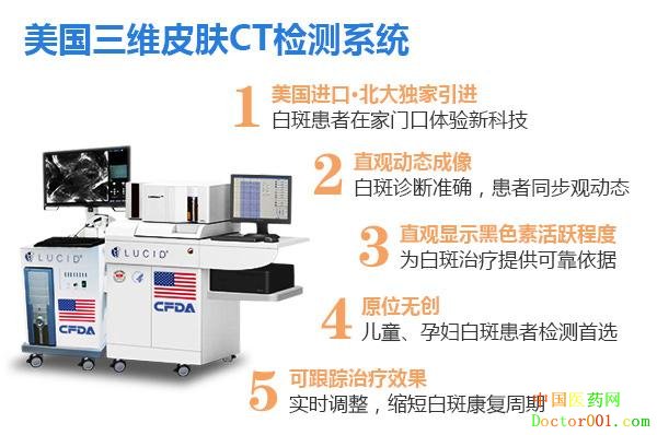 白斑标准检测—三维皮肤CT落户北大 作为安徽省老牌白癜风专业医院,合肥北大白癜风医院引进三维皮肤CT,基于光学聚焦原理,全面的检测皮肤的病变状况,三分钟了解皮肤白斑情况,科学评估白癜风病因、病情、病型,为患者做出准确的诊疗判断,进而针对病情制定适合的诊疗方案。